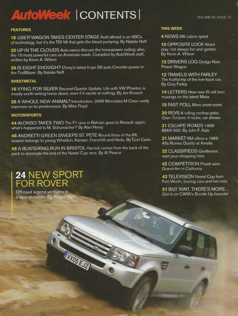 Reviews AUTOWEEK 2005 APR 11 - M6 CABRIO, M-B G-CLASS, TRALIBLAZED SS, McLAREN P8