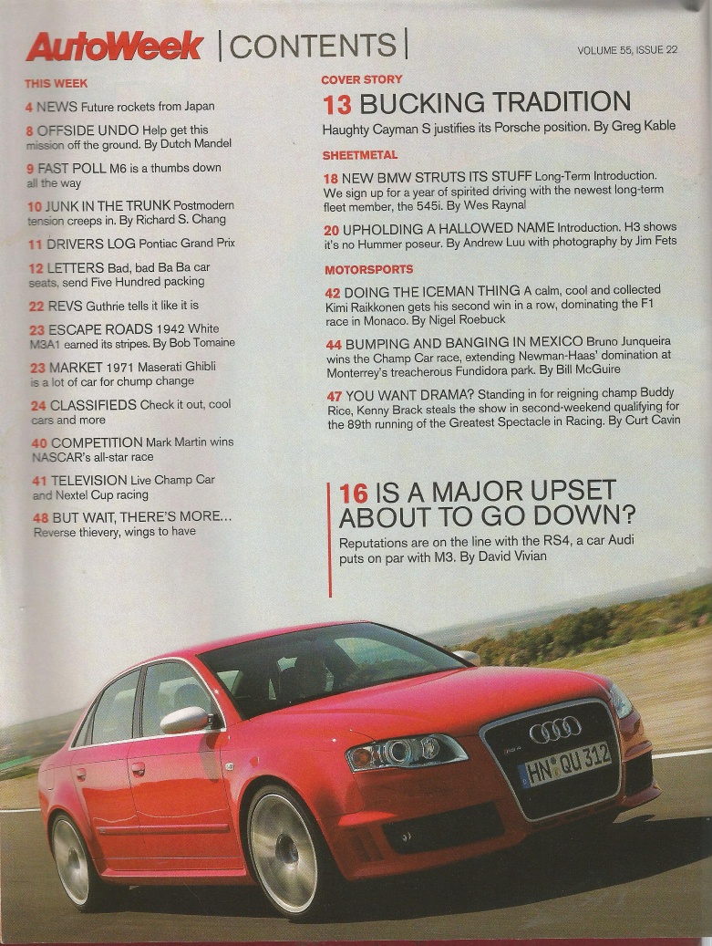 Reviews AUTOWEEK 2005 MAY 30 - GT-R, IS 430, PORSCHE CAYMAN, '42 WHITE M3A1, AUDI RS4