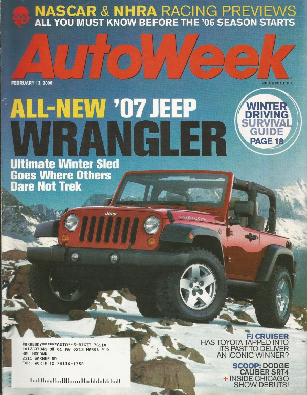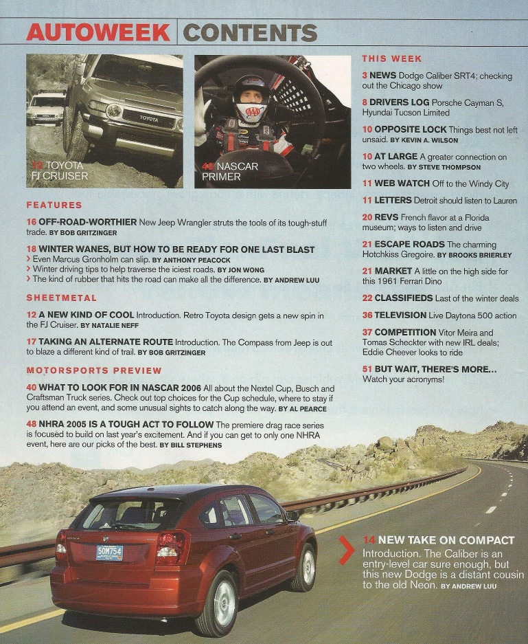 Reviews AUTOWEEK 2006 FEB 13 - CALIBER SRT4, WRANGLER, FJ CRUISER, HOTCHKISS GREGOIRE