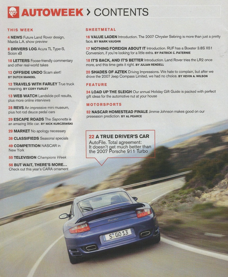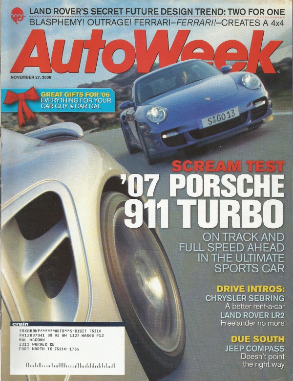 Reviews AUTOWEEK 2006 NOV 27 - 911 TURBO, NEW SEBRING, LR2, '57 BANDINI SAPONETTA