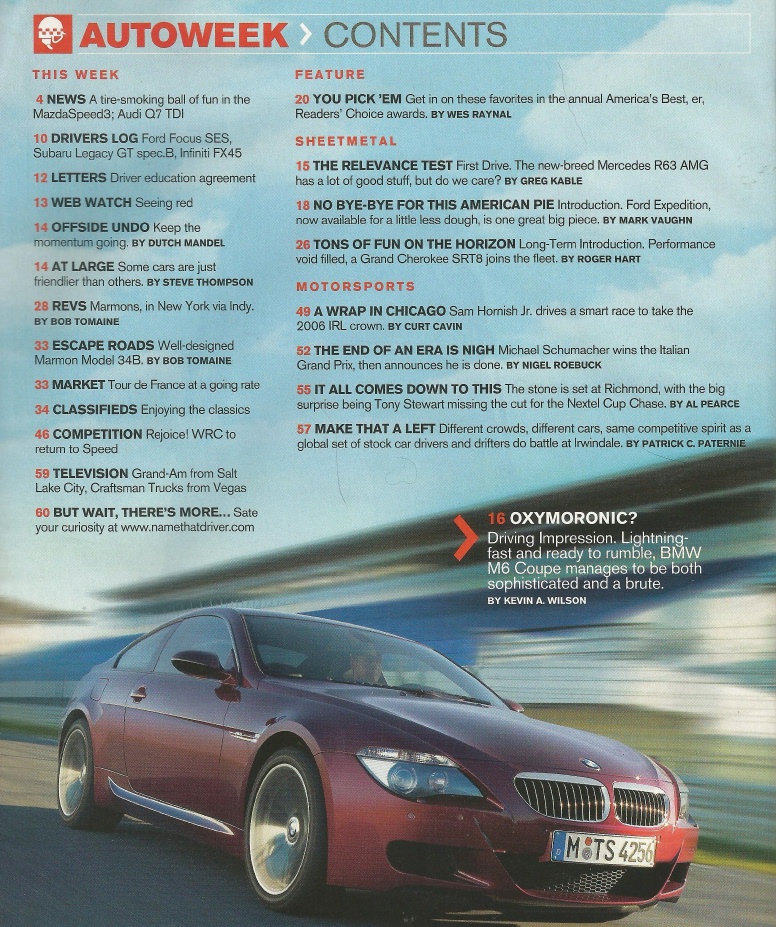 Reviews AUTOWEEK 2006 SEPT 18 - AUDI V12 Q7 TDI, M-B R63 AMG, V10 M6, '22 MARMON 34B