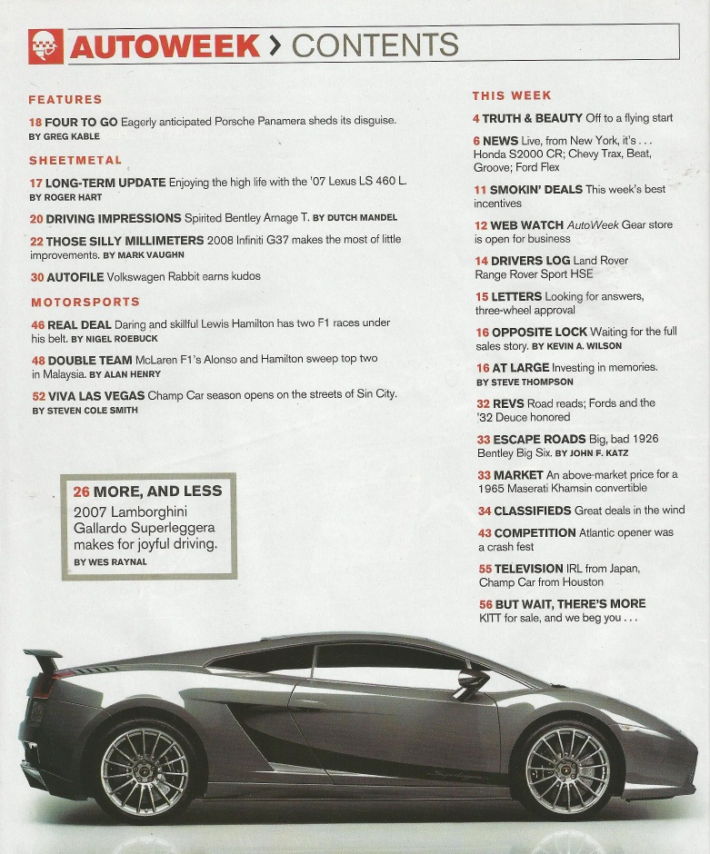 Reviews AUTOWEEK 2007 APR 16 - LS 460L, '26 BENTLEY BIG 6, SUPERLEGGERA, PANAMERA