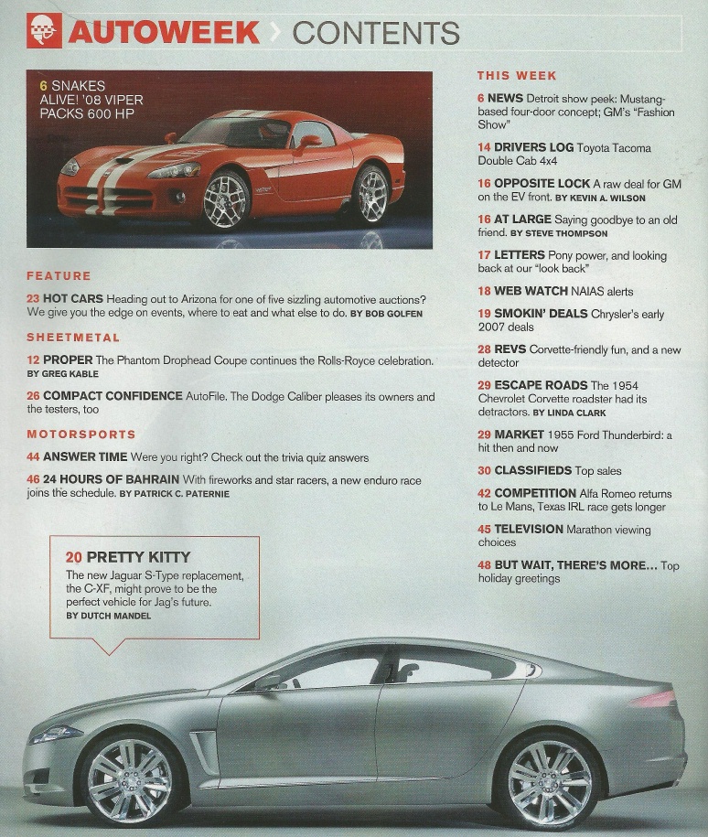 Reviews AUTOWEEK 2007 JAN 08 - JAG C-XF, NEW VIPER, '54 VETTE, R-R PHANTOM DROPHEAD