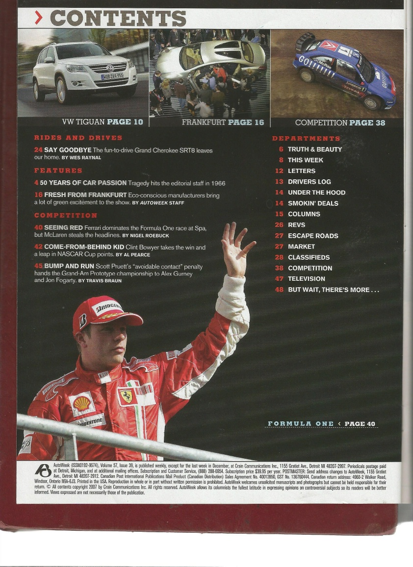 Reviews AUTOWEEK 2007 SEPT 24 - COLIN McRAE, CHEROKEE SRT8, '47 TATRA T87, TIGUAN