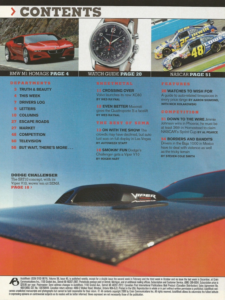 Reviews AUTOWEEK 2008 NOV 17 - QUATTROPORTE S, XC60, M1, RAPTOR, CHALLENGER SRT10