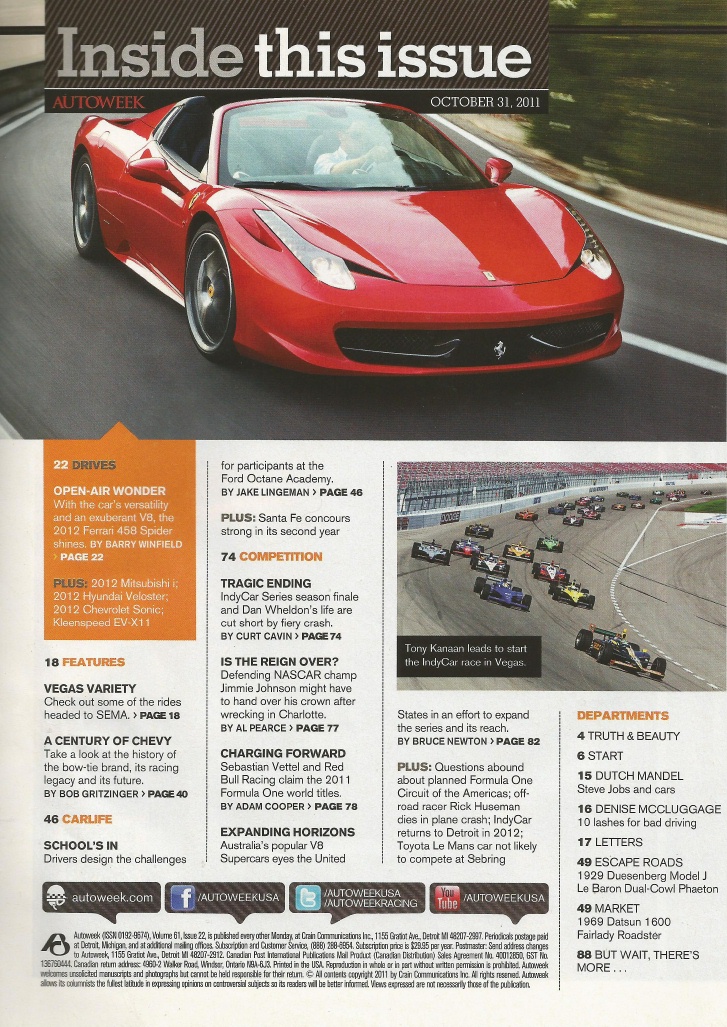 Reviews AUTOWEEK 2011 OCT 31 - VELOSTER, 458 SPIDER, 1929 DUESEY J LeBARON DUAL-COWL