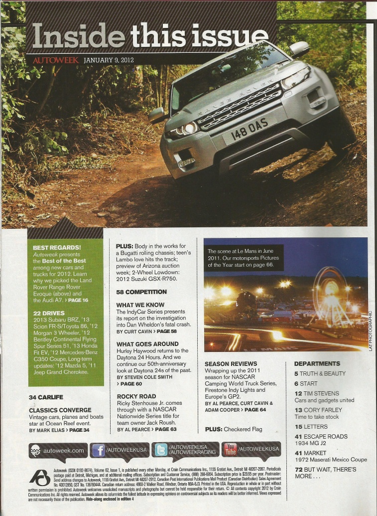 Reviews AUTOWEEK 2012 JAN 09 - EVOQUE, AUDI A7, GSX-R750, 1934 MG J2, BMW GRAN COUPE