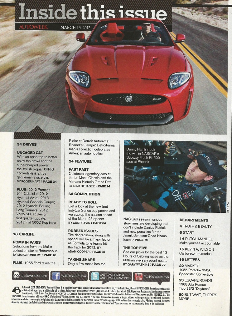 Reviews AUTOWEEK 2012 MAR 19 - FERRARI F12, XKR-S, 911 CABRIO, ALFA TIPO 33/2 DAYTONA*