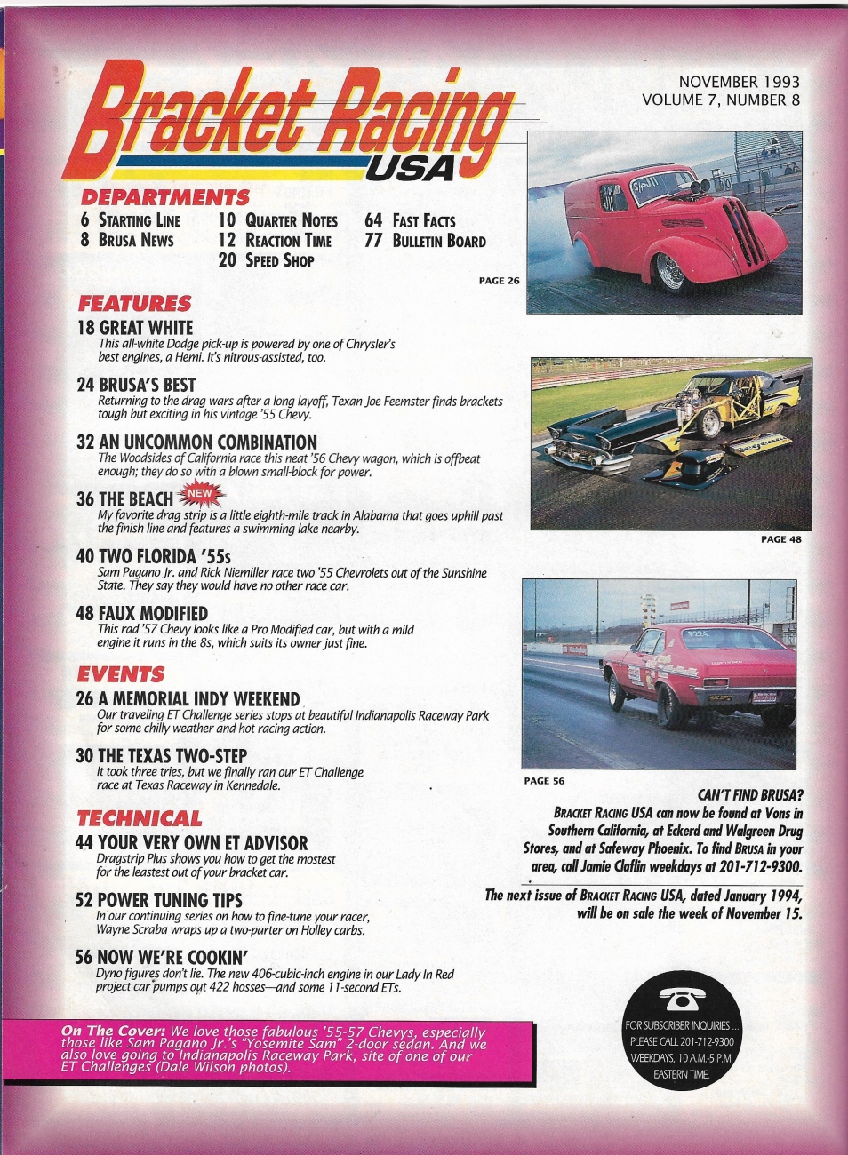 Reviews BRACKET RACING USA 1993 NOV - '57 CHEVY, PROJECT NOVA, 2- '55 FLORIDA CHEVYS