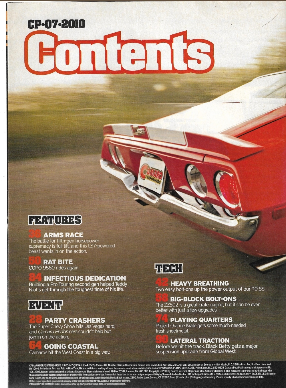 CAMARO PERFORMERS 2010 JULY - COPO 9560, ZZ502 CRATE, ORANGE SHEETMETAL