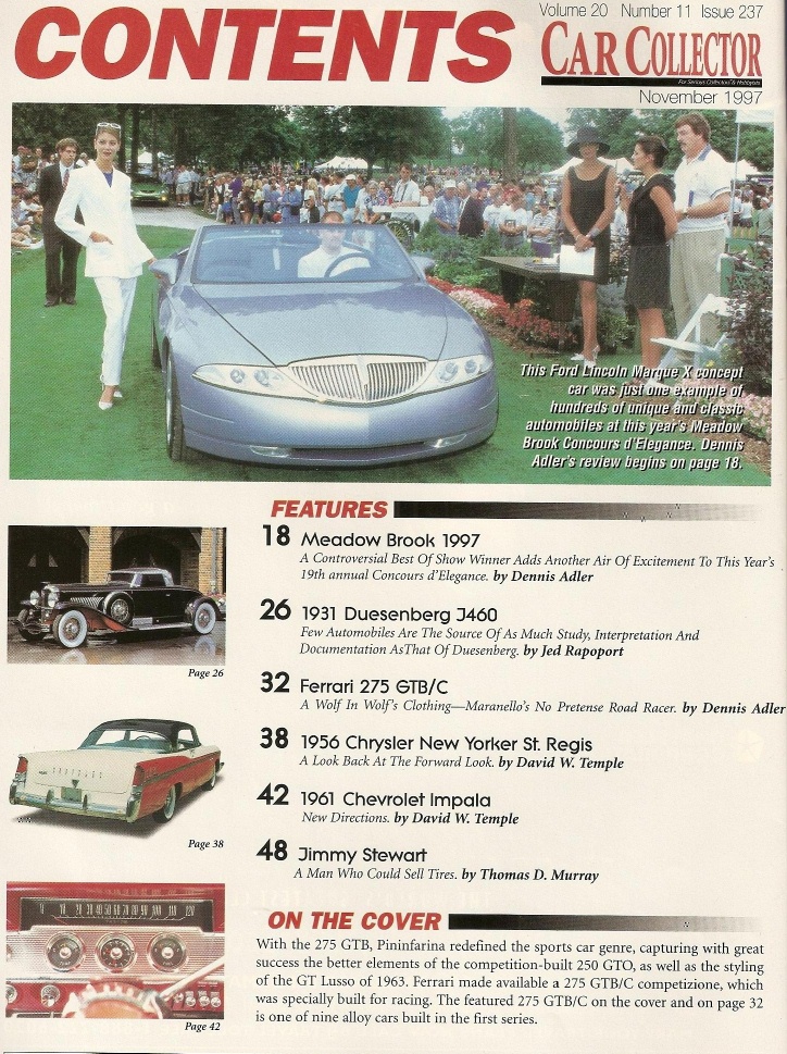 Reviews CAR COLLECTOR 1997 NOV - STEWART, FERRARI 275 GTB/C, '31 DUESENBERG,'61 IMPALA