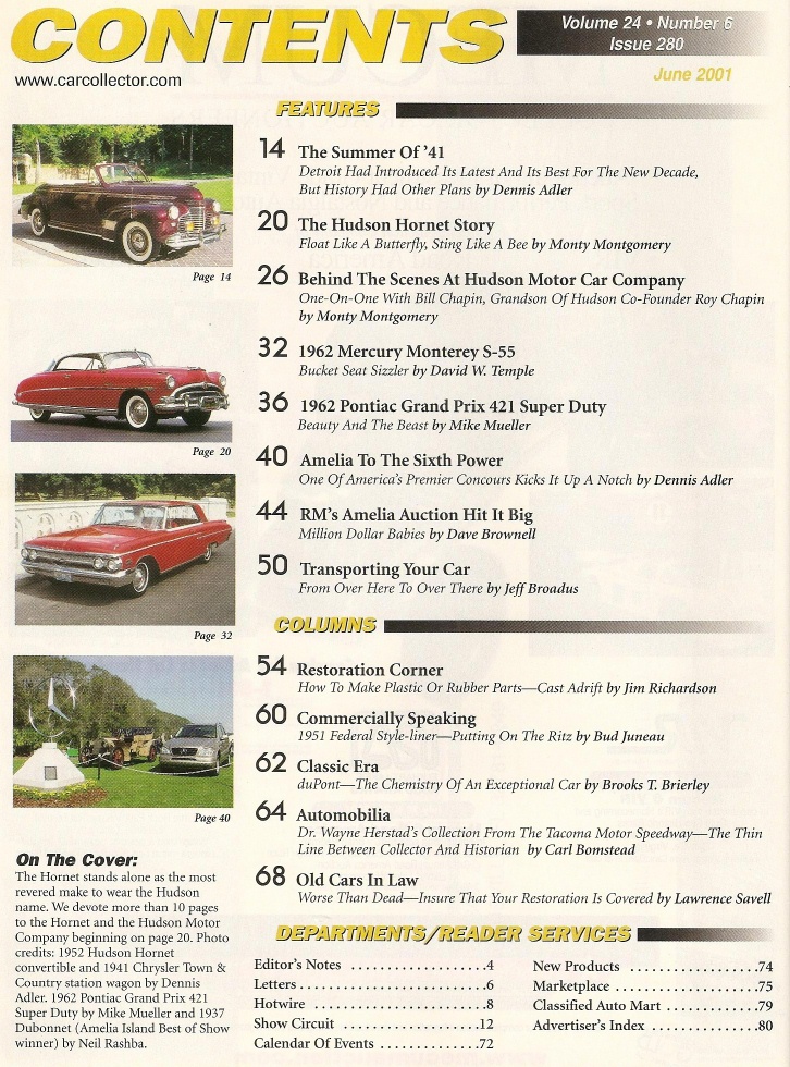 Reviews CAR COLLECTOR 2001 JUNE - HUDSON HORNET, '41 SUMMER CARS, '62 PONTIAC GRAND PRIX