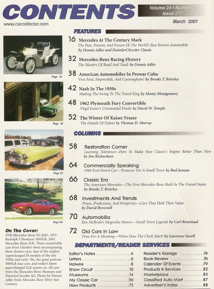 Reviews CAR COLLECTOR 2001 MAR - '62 PLYMOUTH FURY, NASH IN THE 50'S, MERCEDES