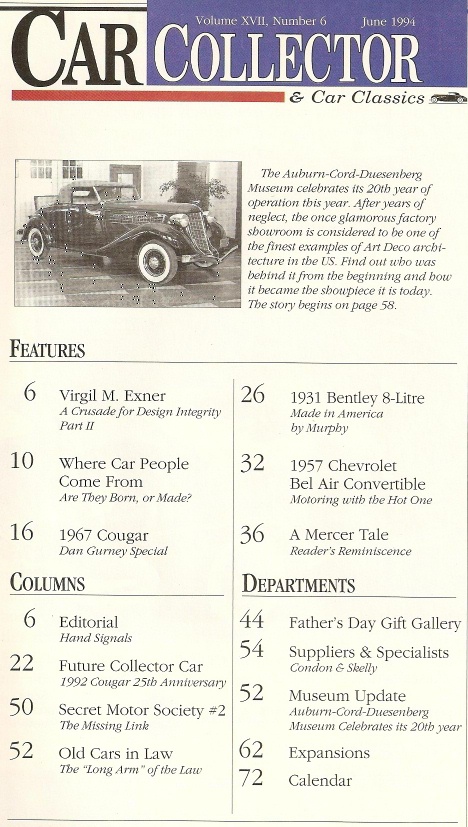 Reviews CAR COLLECTOR & CAR CLASSICS 1994 JUNE - '67 COUGAR, '31 BENTLEY, MERCER TALE