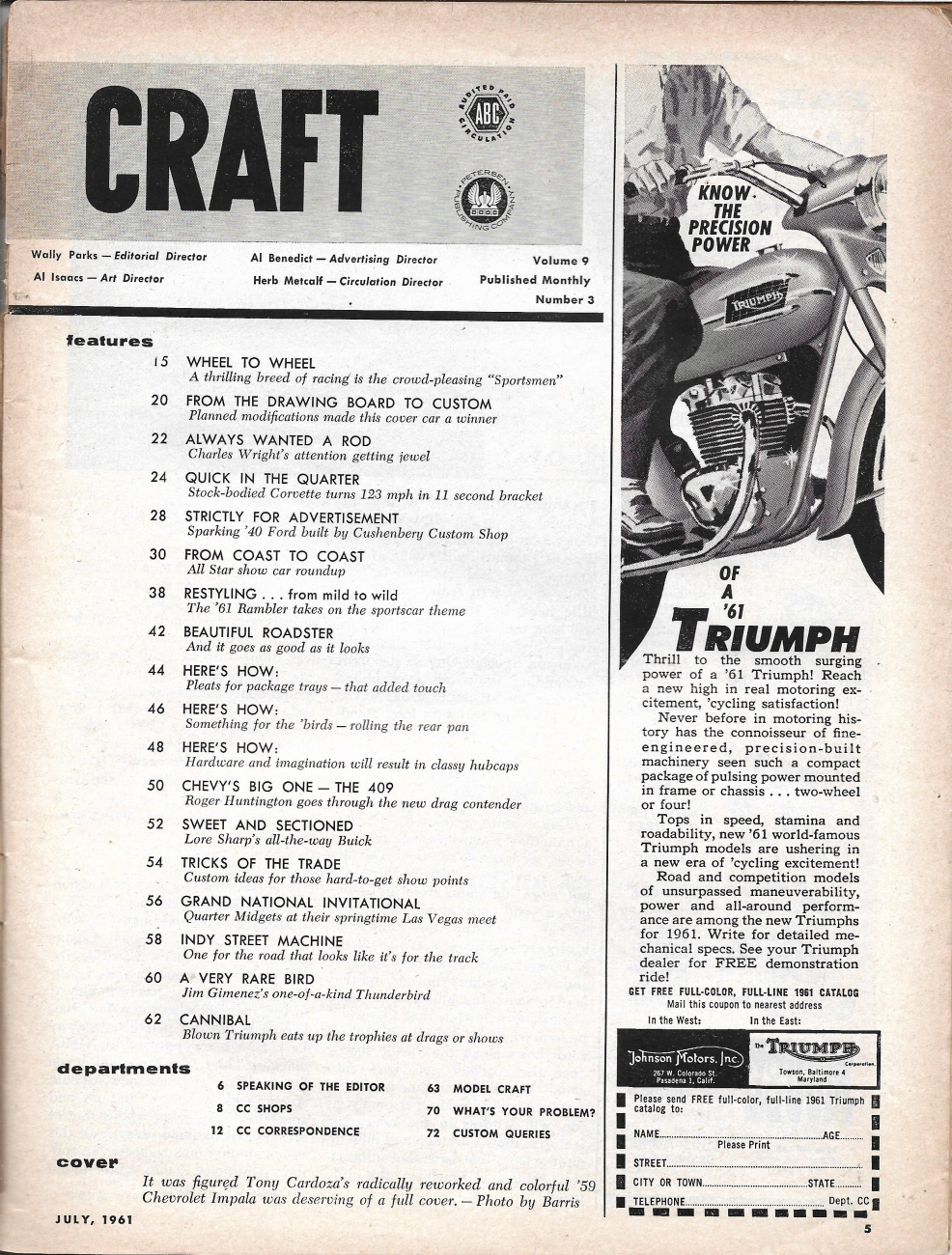 Reviews CAR CRAFT 1961 JULY - CHEVROLET 409,'59 IMPALA, ALL STAR SHOW CARS, ROLLED PANS