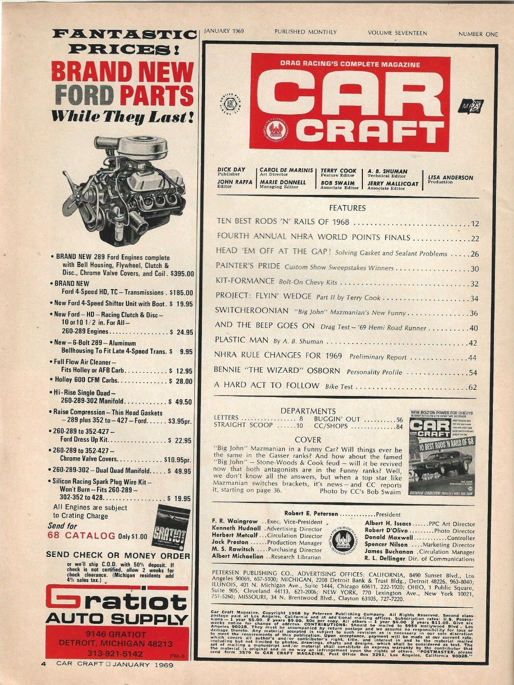 Reviews CAR CRAFT 1969 JAN - TEST HEMI ROAD RUNNER, 'RODS N RAILS '68, BIG JOHN, 440'S