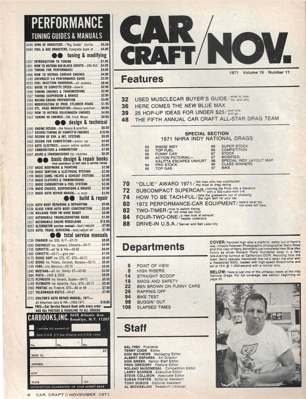 Reviews CAR CRAFT 1971 NOV -V-8 PINTO, INDY NATS PICS, MUSCLECAR BUYER'S GUIDE, HOP-UP*