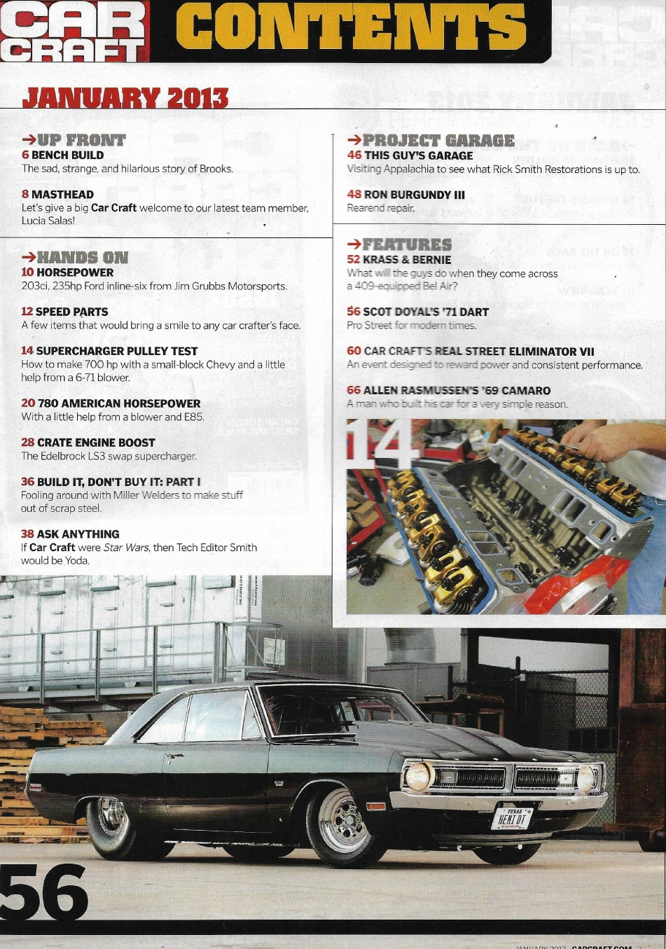Reviews CAR CRAFT 2013 JAN - 1400HP HEMI DART, BOOST ISSUE, EDELBROCK FOR CHEVELLES