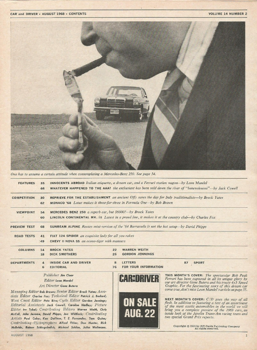 Reviews CAR & DRIVER 1968 AUG - FIAT, MERCEDES 250, INDY TURBINE MONACO GP