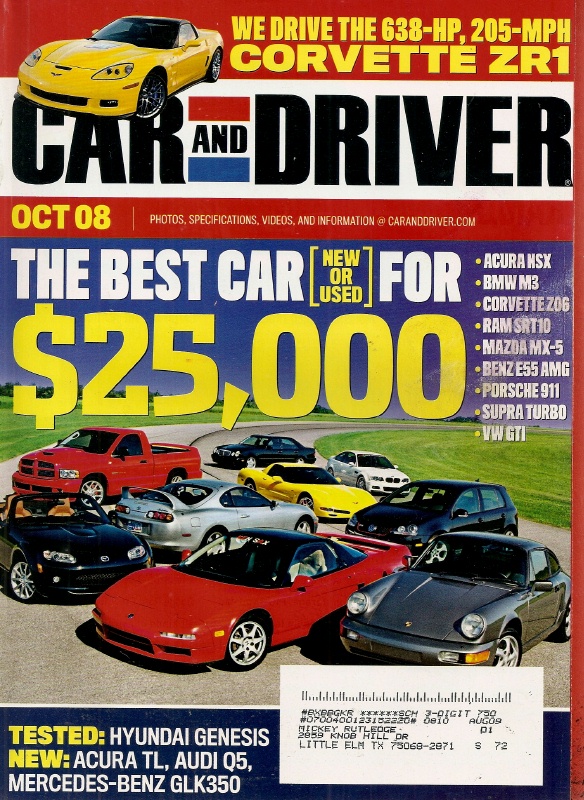 Reviews CAR & DRIVER 2008 OCT - ZR1 VETTE, NEW CAR vs USED, GENESIS, SCAGLIETTI