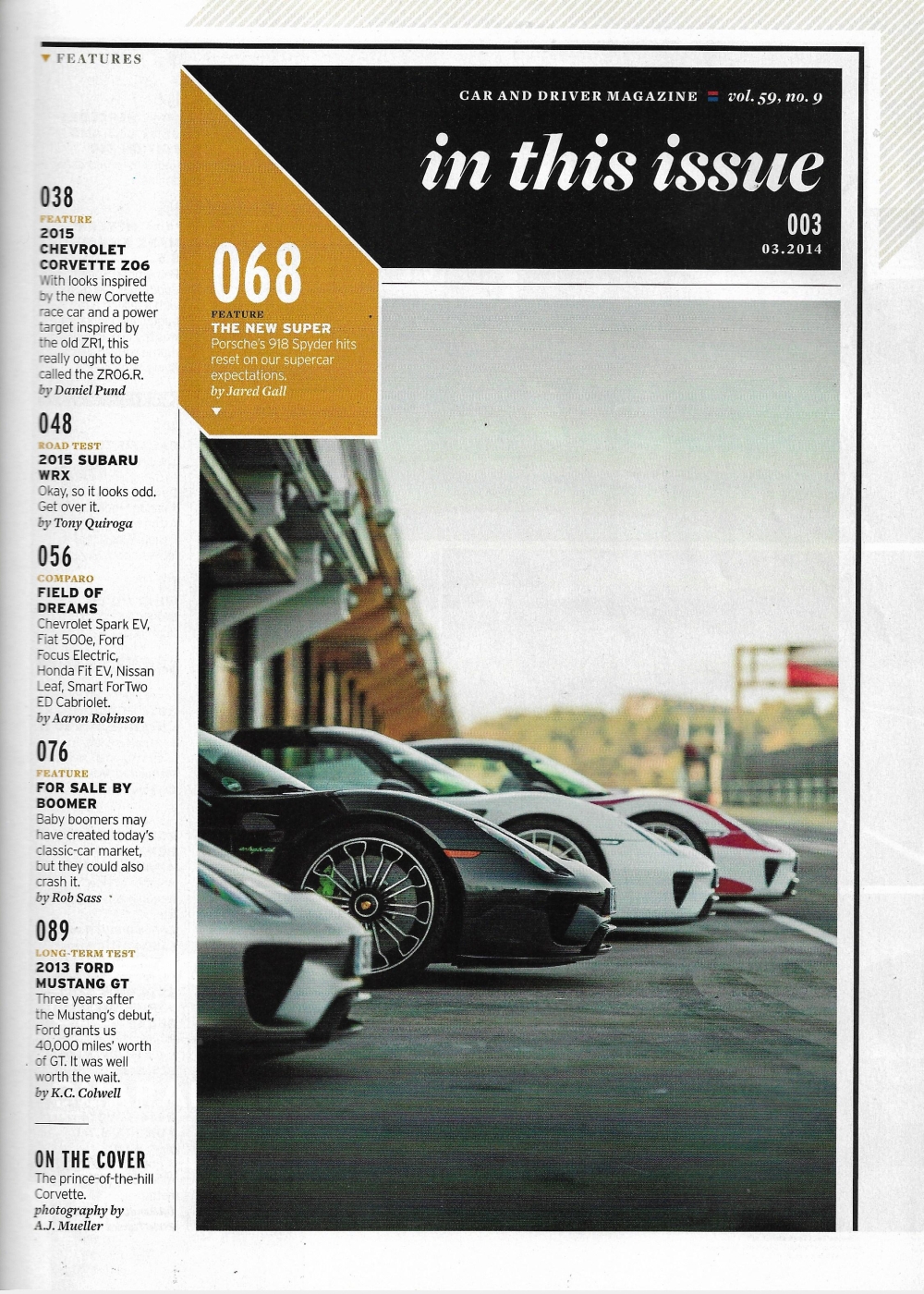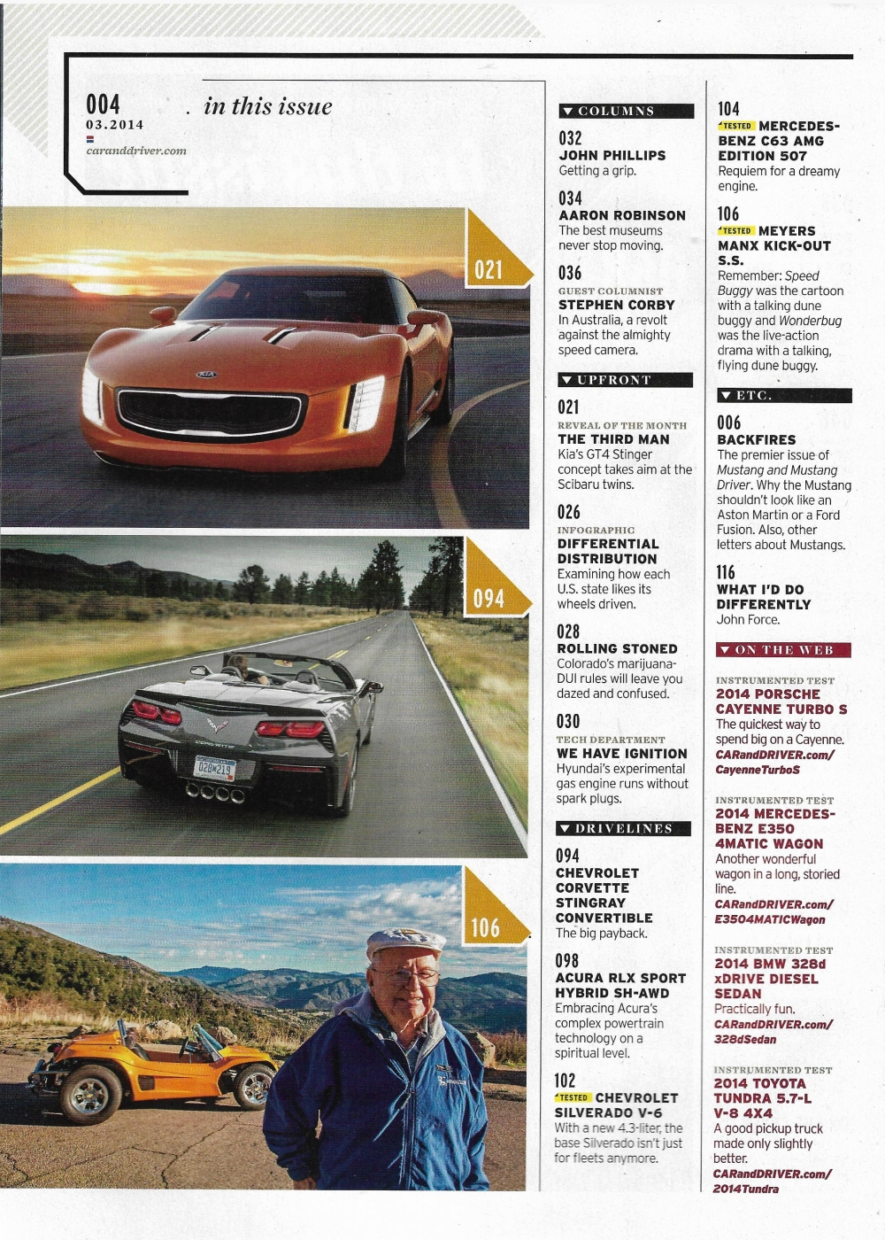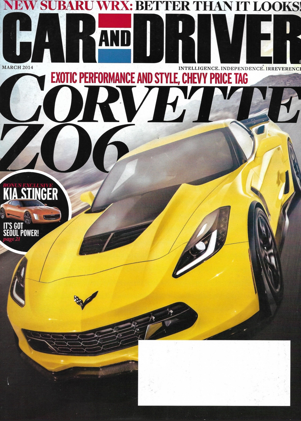 Reviews CAR & DRIVER 2014 MAR - '15 Z06, KAI STINGER, '15 SUBARU WRX, '13 MUSTANG GT