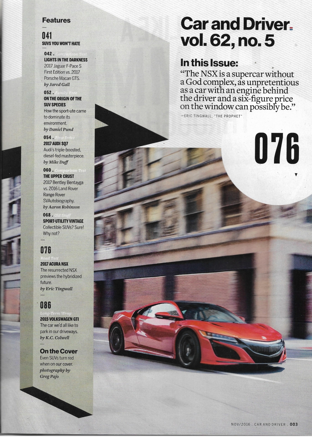 CAR & DRIVER 2016 NOV - CROSSOVERS & SUV'S,MACAN GTS v JAGUAR F-PACE, ACURA NSX