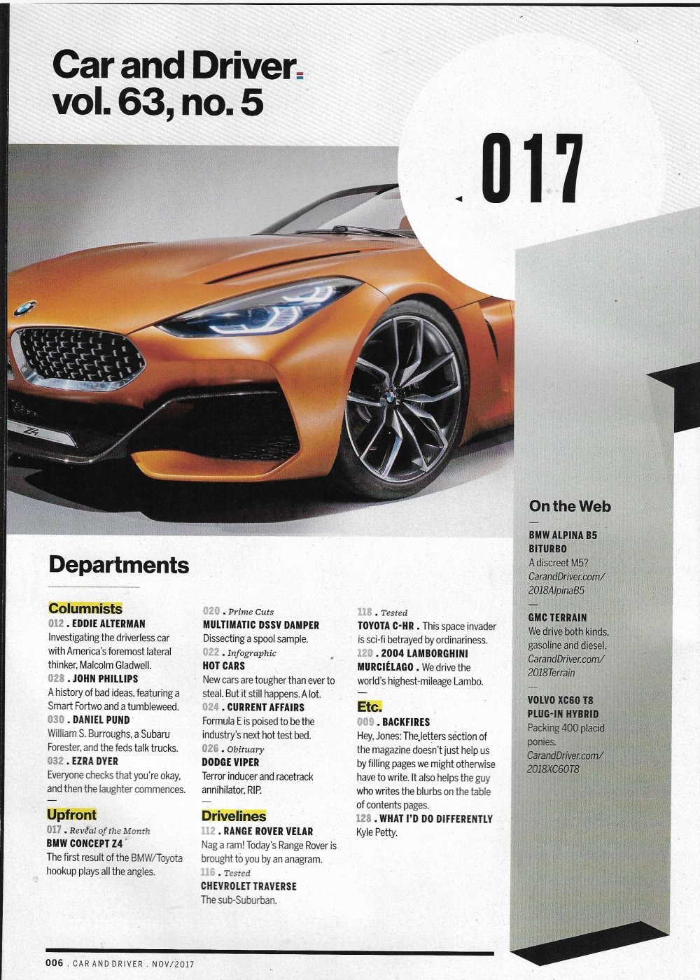 CAR & DRIVER 2017 NOV - ACCORD 2.0T, CHEROKEE TRACKHAWK, ROVER VELAR, TRAVERSE