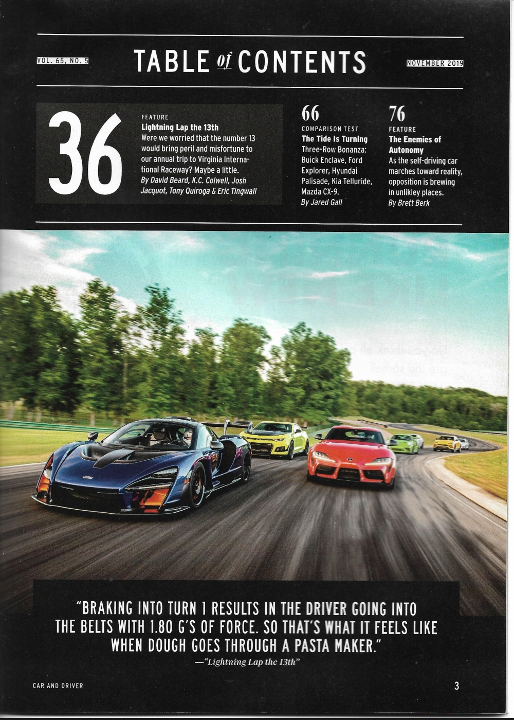 Reviews CAR & DRIVER 2019 NOV - MCLAREN SENNA, SUPRA, CAMARO ZL1 1LE, SPYDER, CARRERA