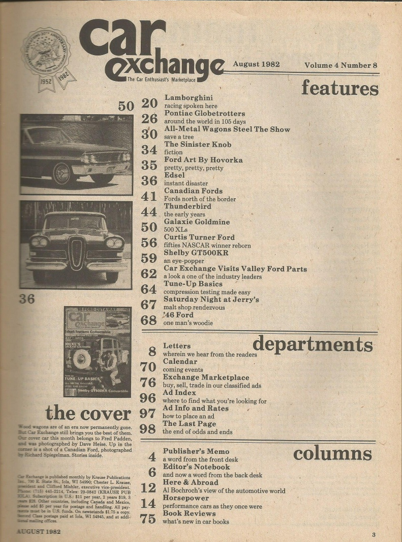 Reviews CAR EXCHANGE 1982 AUG - EDSEL, T-BIRDS, 500XL, SHELBY GTR500KR, LAMBORGHINI,
