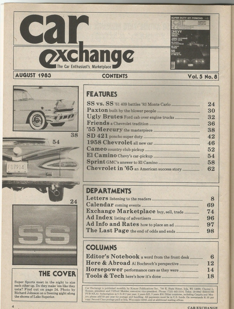 Reviews CAR EXCHANGE 1983 AUG - SS VS. SS PAXTON, '55 MERCURY, CAMEO, EL CAMINO, SPRINT