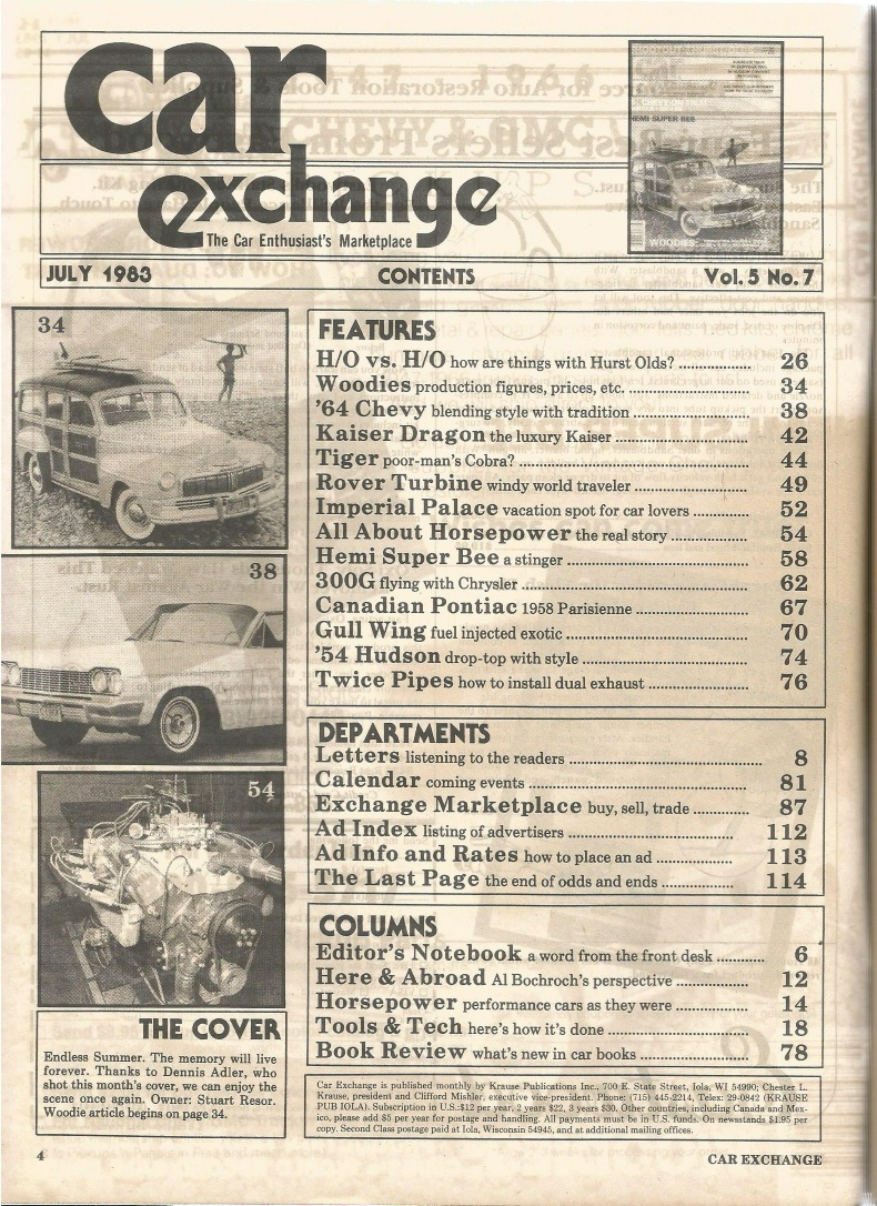 Reviews CAR EXCHANGE 1983 JULY - HURST OLDS,WOODIES, ROVER TURBINE, SUPER BEE, 300G