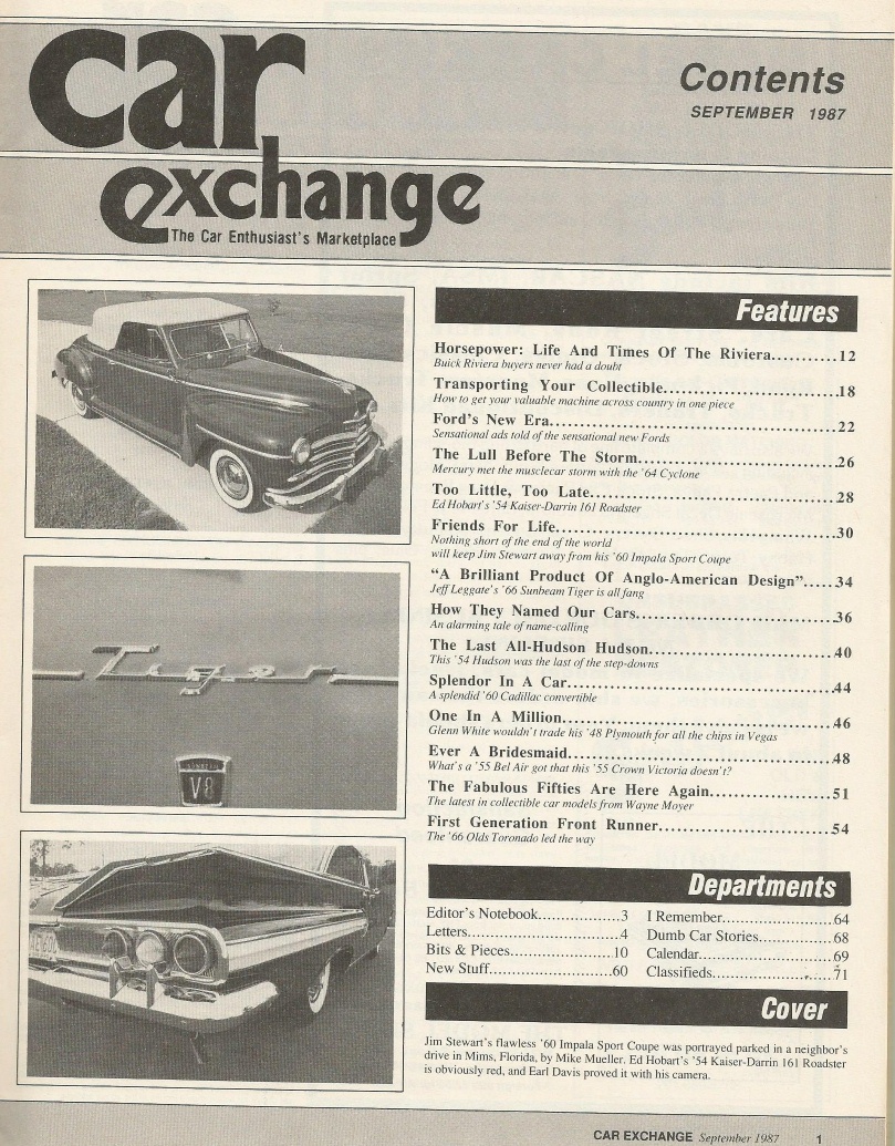 Reviews CAR EXCHANGE 1987 SEPT - RIVIERA, '64 CYCLONE, HUDSON, TORONADO, TIGER