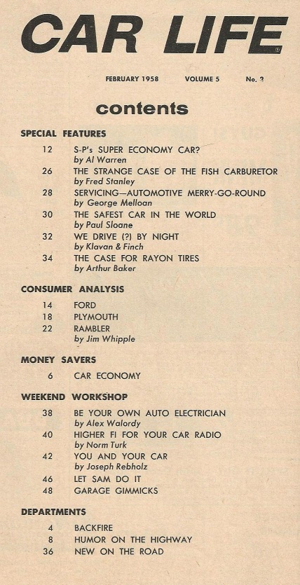 Reviews CAR LIFE 1958 FEB - GOGGOMOBIL, NEW RAMBLER, PLYMOUTH & FORD TESTED,FISH CARBS*