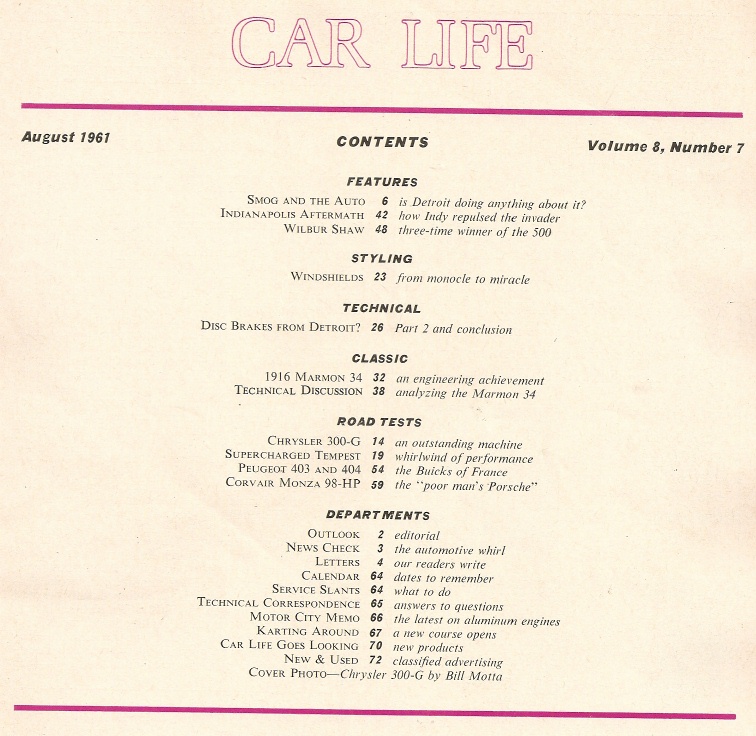 Reviews CAR LIFE 1961 AUG - INDY 500, WILBUR SHAW, 300-G, SUPERCHARGER TEMPEST