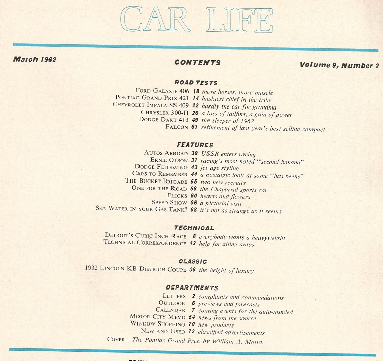 Reviews CAR LIFE 1962 MAR - TESTING 300-H, 409, DART 413, GALAXIE 406, 421 GP