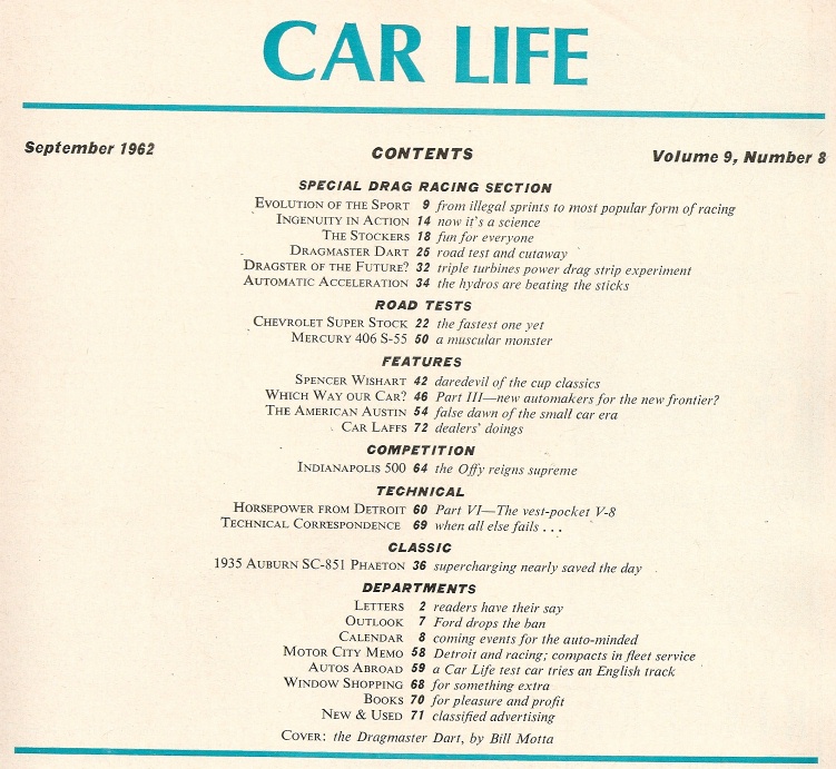 Reviews CAR LIFE 1962 SEPT - DRAG RACING SPECIAL, S-55, SS CHEVY, DRAGMASTER DART, INDY
