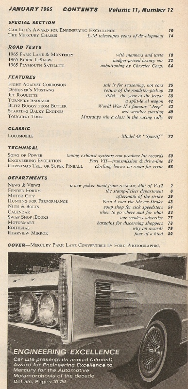 Reviews CAR LIFE 1965 JAN - MERCURY SPECIAL, LaSABRE, BONNEVILLE JETS, JEEP, SATELLITE