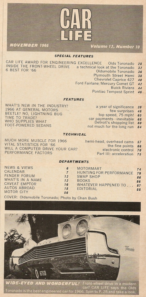 Reviews CAR LIFE 1965 NOV - TORONADO SPECIAL, NEW CARS, NEW BIG ENGINES, VW