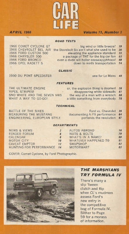 Reviews CAR LIFE 1966 APR - CYCLONE 390 GT, du PONT, CHRYSLER 300, BRONCO, A/FX PONY