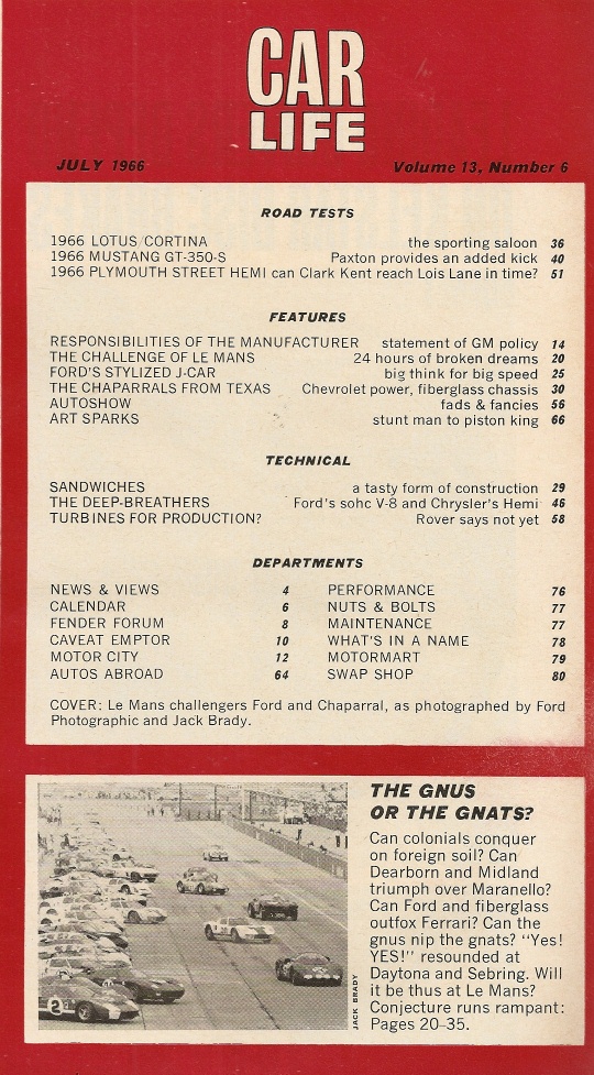 Reviews CAR LIFE 1966 JULY - GT-350-S,STREET HEMI,LEMANS,GT-P J-CAR,CHAPARRALS,SPARKS