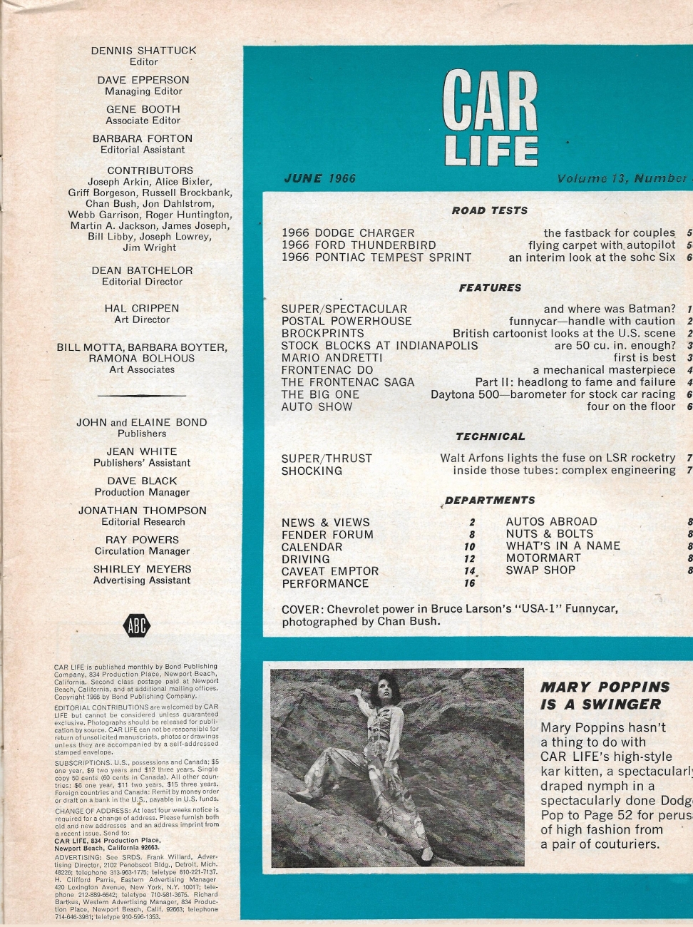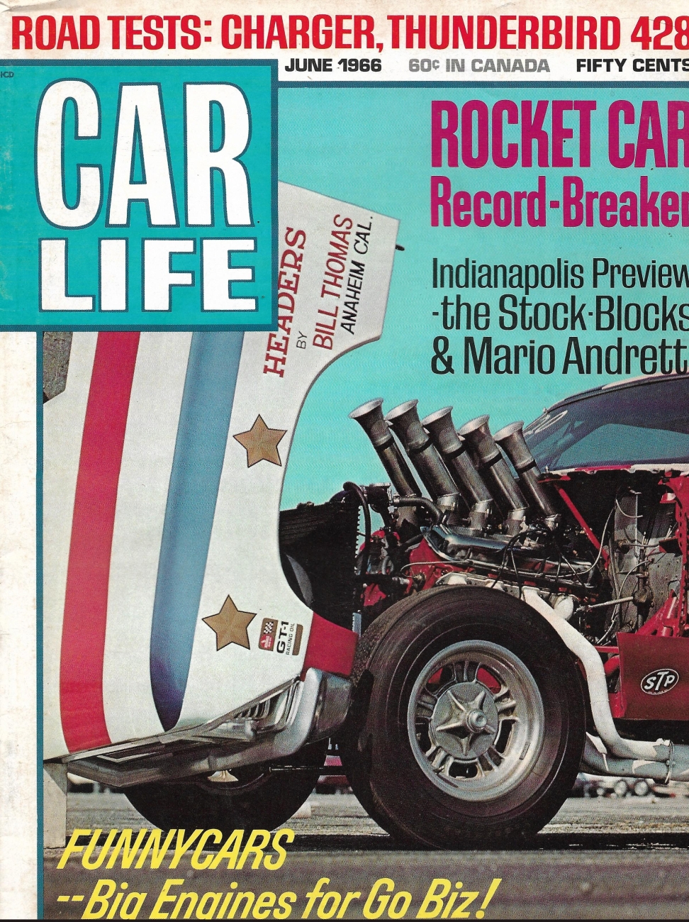 CAR LIFE 1966 JUNE - ROCKET CAR, FUNNYCARS,ANDRETTI,TEST CHARGER,T-BIRD,TEMPEST