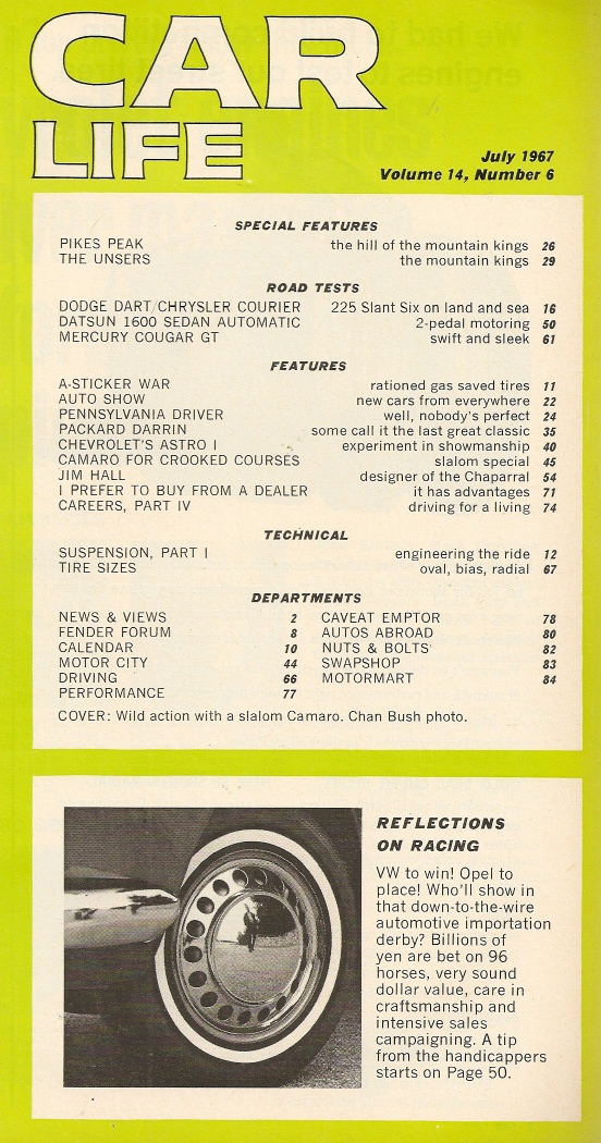 Reviews CAR LIFE 1967 JULY - J HALL,DART 6,PIKES PEAK,PACKARD DARRIN,ASTRO,CAMARO SS