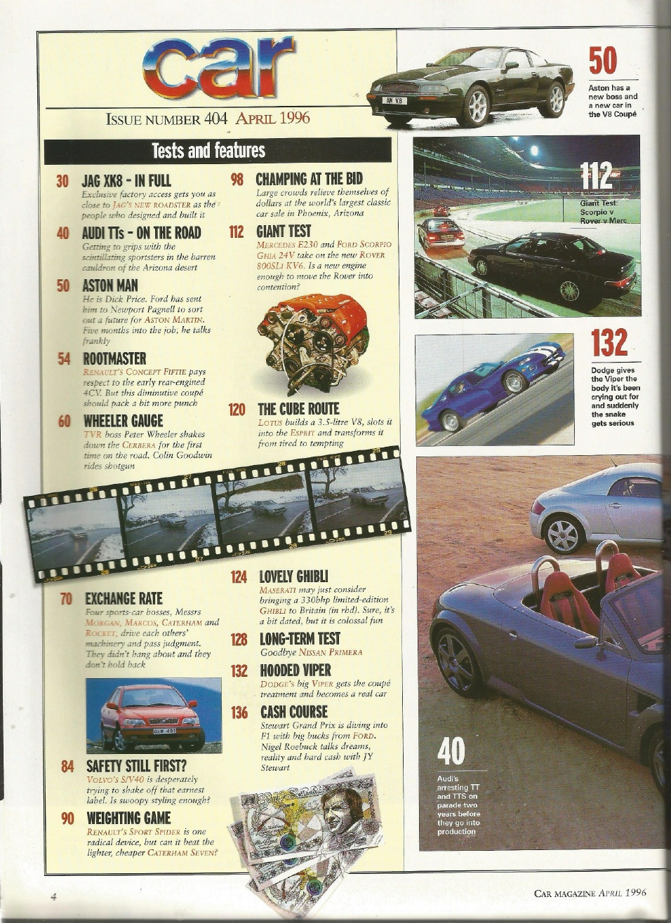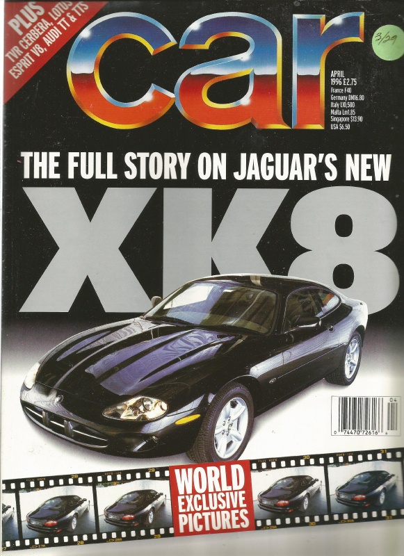 Reviews CAR MAGAZINE 1996 APR - NEW XK8, TT-TTS, RENAULT FIFTIE, CERBERA
