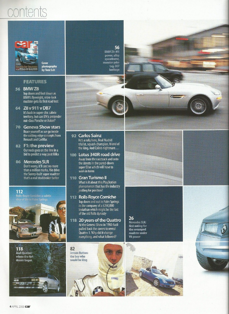 Reviews CAR MAGAZINE 2000 APR - ROADSTER & QUATTRO SPECIALS, SAINZ, KOLEOS