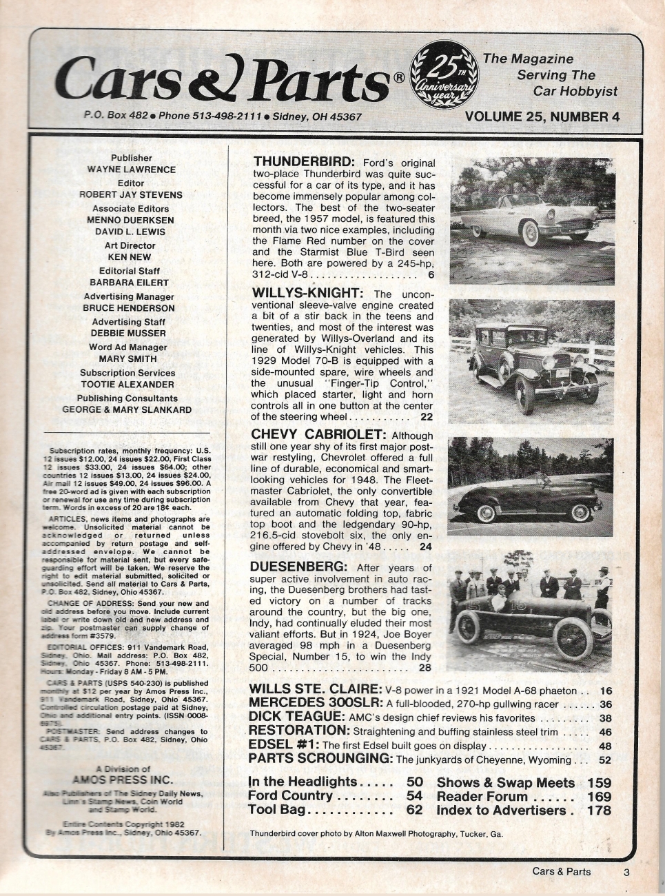 Reviews CARS & PARTS 1982 APR - MERCEDES 300SLR, '57 T-BIRD, EDSEL,WILL STE CLAIRE, AMC