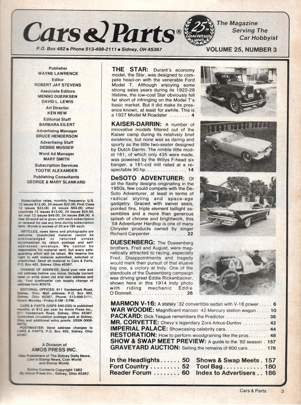 Reviews CARS & PARTS 1982 MAR - DUESENBERG, '54 KAISER-DARRIN, '59 DESOTO, PREDICTOR*