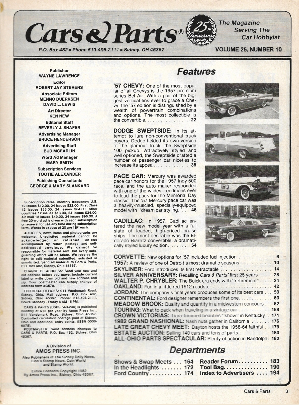 Reviews CARS & PARTS 1982 OCT - '57 SPECIAL, FORD, CHEVY BEL AIR CONV, MERC PACE CAR