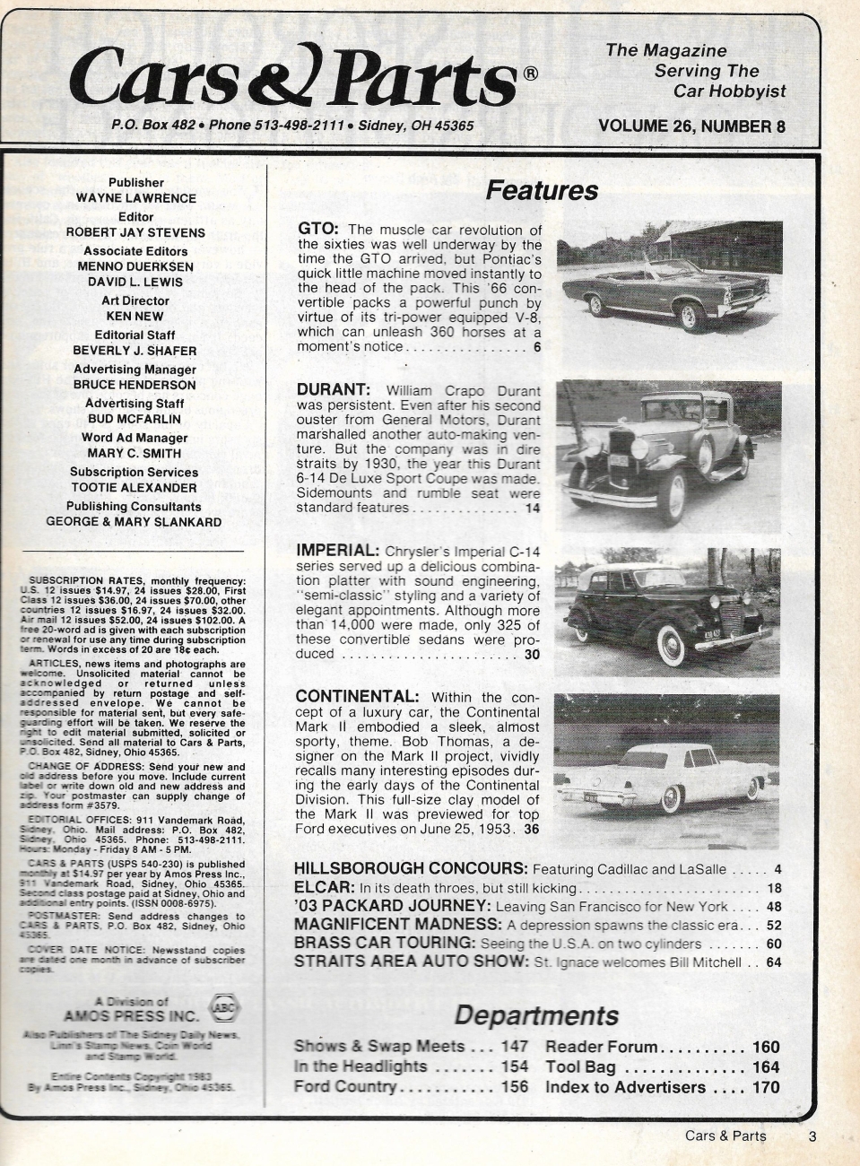 Reviews CARS & PARTS 1983 AUG - CONTINENTAL MARK II, '66 GTO CONV, ELCAR, '30 DURANT