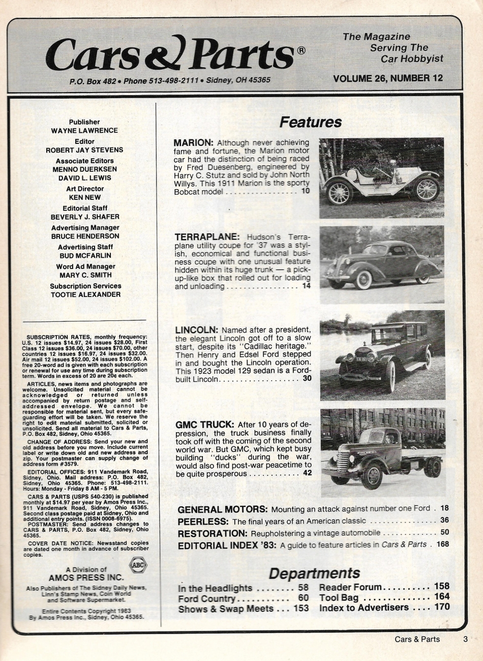 Reviews CARS & PARTS 1983 DEC - GMC TRUCK, REUPHOLSTER, PEERLESS, '23 LINCOLN 129*