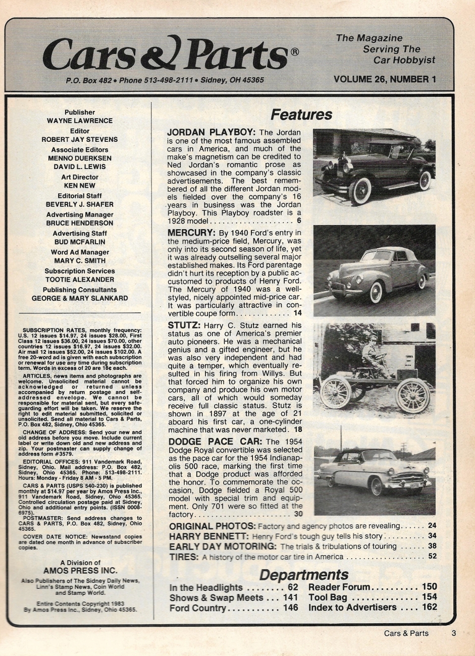 Reviews CARS & PARTS 1983 JAN - '54 INDY PACE DODGE 500 CONV, '28 JORDAN PLAYBOY